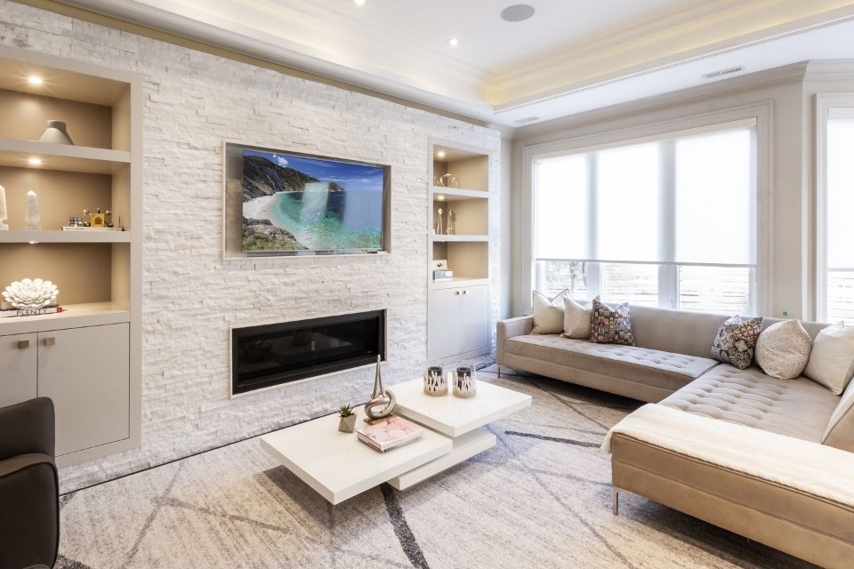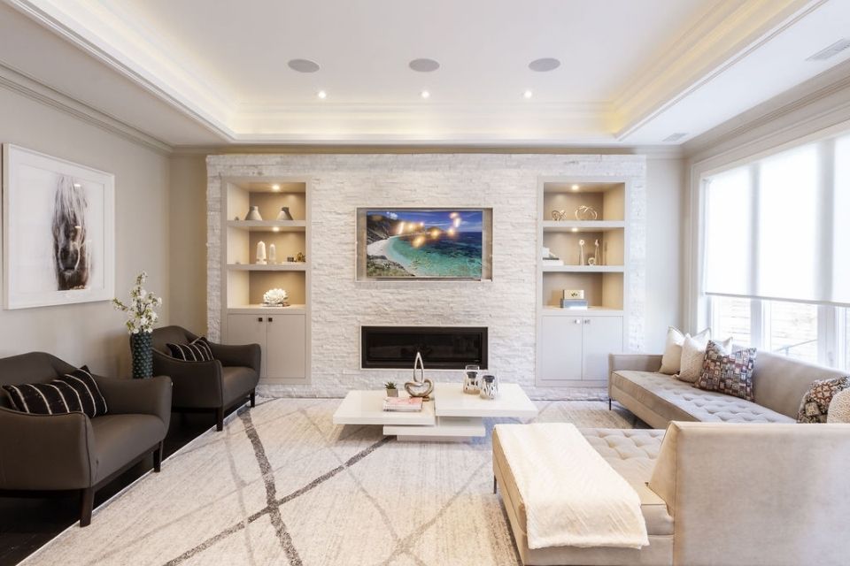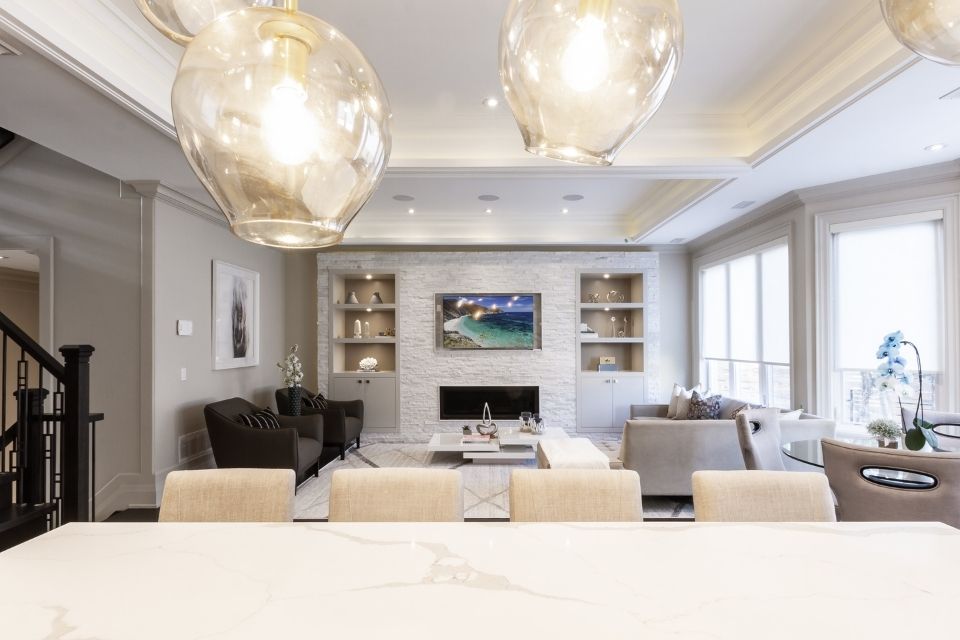 This project was a smart home, so we had to design the cabinetry and ceiling with integrated smart lighting and speakers. The lights were both LED and Puck lights set at different scenes, with subwoofers and speakers built-in.