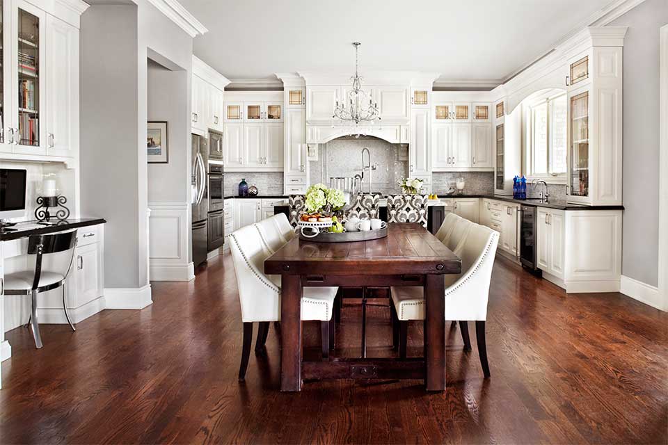Whether it's a quick breakfast on the way out the door or a family game night, a kitchen plays so many roles in your daily life. For this reason, when you are designing, updating or redecorating a kitchen, you want to think of all the ways that the space will be used. From a desk for organizing bills and family schedules to a large table for family dining, game night or school projects, Catherine-Lucie Horber made sure her kitchen design, pictured below, would leave the space ready for whatever her client's family needed. Pictured above, designer Evelyn Eshun chose to visually blend the lower cabinetry with the hardwood flooring creating an even more expanded feel to her client's already spacious kitchen concept.